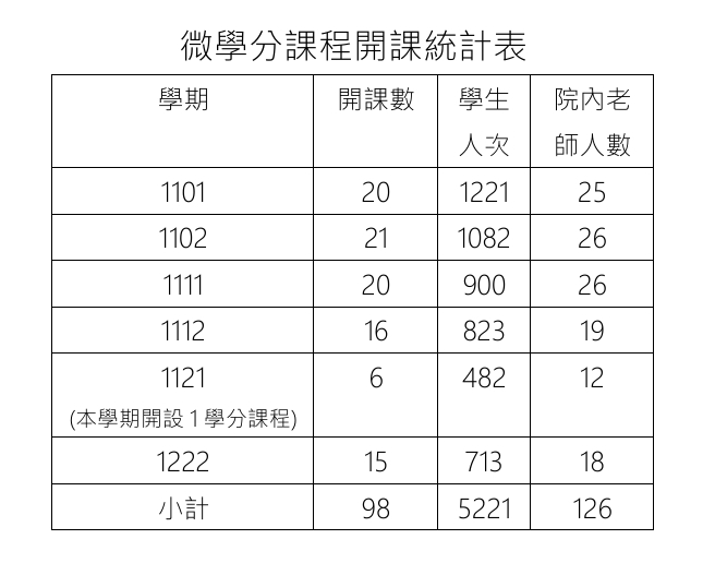 截至112-2學期,學校共開設98門微學分課程,由院內教師與業師協同授課,總選修人次達5221,顯示微學分課程深受學生喜愛,能有效激發學習動機。學生回饋調查中,各指標平均分數皆超過4.0,顯示學生普遍肯定此課程設計,並透過修課探索個人專長,對廣域知識展現高度興趣,顯示微學分課程具備延伸學習深度與廣度的成效。