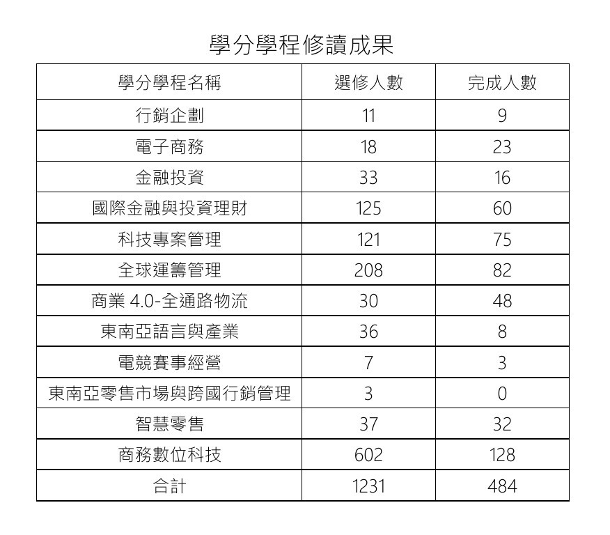 為提升學生就業競爭力與第二專長的養成,自108學年度起,學校規定四技新生須於畢業前修畢至少一門所屬學院內(或經學院同意之跨院)開設的(微)學分學程,並完成一門數位科技微學分學程。此舉旨在整合教學資源,拓展學生學習領域,強化其職場競爭力。110至112學年間,共有1231人次申請修習學分學程,最終有484人次順利取得證書。學分學程除可補足學生專業知識的不足,也有助於多元能力的發展,成為學生進入職場前的重要實務基礎與能力加值途徑。