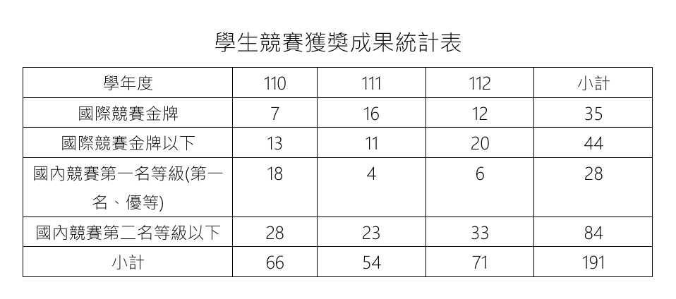 本校鼓勵專題成果對外參加競賽,並給予材料和交通費等補助,歷年學生參與競賽獲獎之統計,累計共獲得191個獎次。